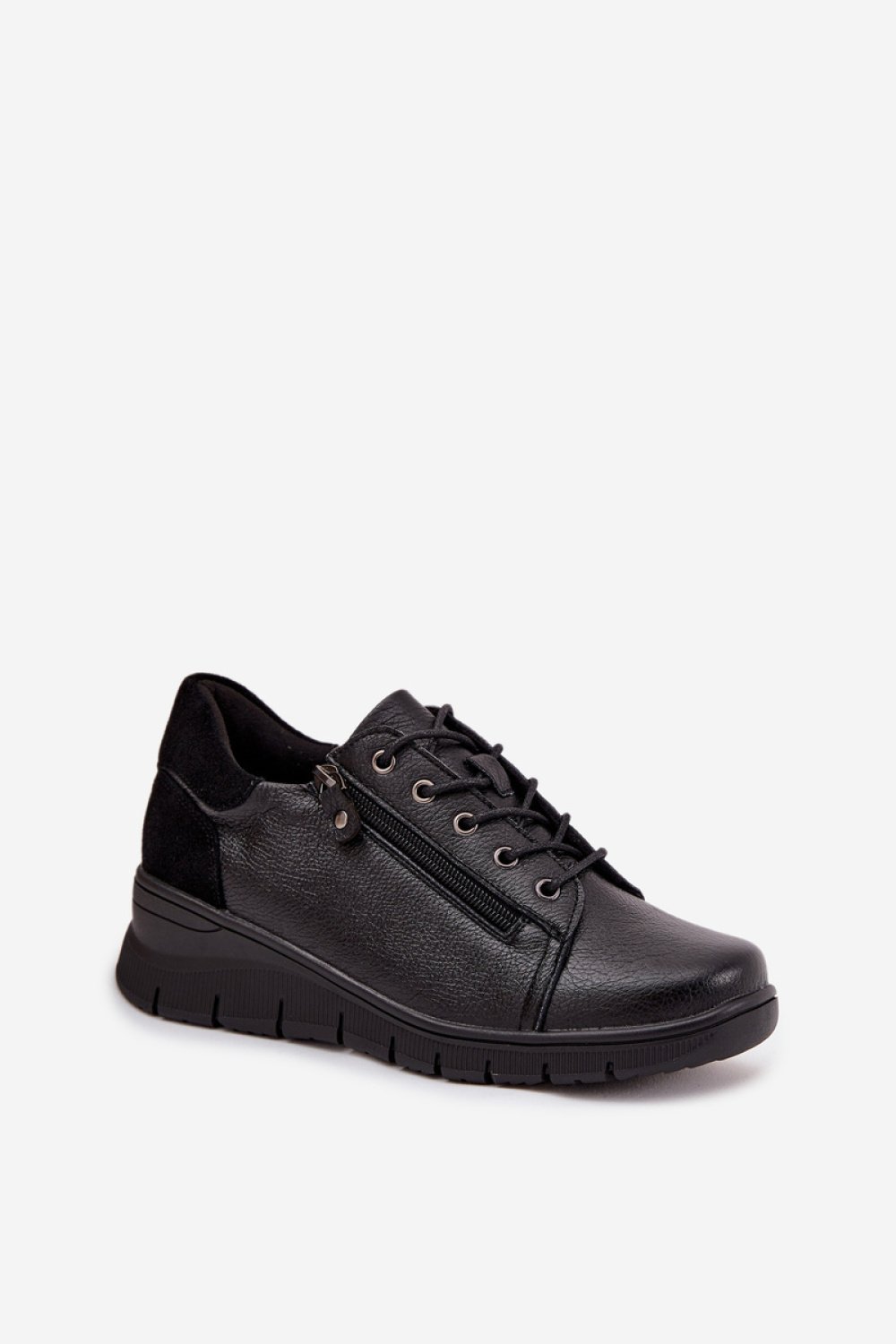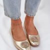 Women’s ballerinas made of eco leather are a classic choice for everyday wear. The flat sole ensures comfort throughout the day, and the rounded toes add a delicate, feminine look. The front of the shoes is adorned with subtle decoration, which introduces an original and stylish element. These ballerinas are the perfect option for both casual and more elegant stylings.