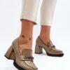 Leather pumps are the perfect choice for any woman who appreciates fashionable and comfortable footwear! This model is set on a delicate platform and a massive high heel in the form of a post. In addition, they have a stiffened heel counter. The front decorated with a strap and chain. A great model for many stylings!