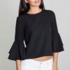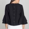 A comfortable blouse made of delicate material with decorative buttons on the back and a frill at the sleeves. A short front adds sex appeal.