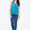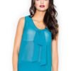 Blouse of airy material, sleeveless, with a half-round neckline. A loose-fit model finished with an impressive tie.