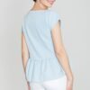 Women’s blouse made of pleasant to the touch, slightly stretchy fabric mix. Simple cut with sleeves falling discreetly on the shoulders. Model with a wide V neckline, joined by crossed stripes of fabric. The bottom finished with an asymmetrical frill that makes it fit the hips nicely. Featuring a brand name plaque on the side.