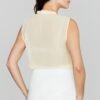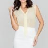 Blouse made of delicate, fashionably transparent fabric in pastel shades. Model with a serek neckline finished with a sash for tying, fastened with buttons. Sleeveless blouse with wide straps covering the upper part of the arms.
