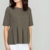 Slightly oversize form allows to cover up body imperfections. A line with a slightly longer back, short sleeves finished with a cuff. Round neckline, close to the neck, fastened at the back with a covered zipper. Convertible pleats at the front.