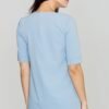 Slightly oversize form allows to cover up body imperfections. A line with a slightly longer back, short sleeves finished with a cuff. Round neckline, close to the neck, fastened at the back with a covered zipper. Convertible pleats at the front.