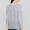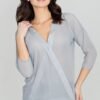 Blouse with 3/4 sleeves with an interesting cut. It has a spectacular envelope neckline with a button. Delicately transparent. Perfect for tight trousers.