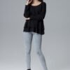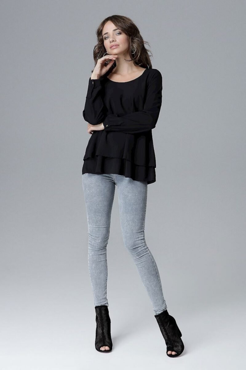 Long sleeve blouse with a half round neckline. A loose-fitting model, finished with an impressive frill. Perfect with tight jeans.