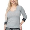 Cotton blouse with a v-neck. The blouse has a fitted cut, 3/4 length sleeves and cuffs made of eco-leather.