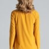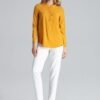 Classic long sleeve blouse with three snap fasteners. A semi-circular neckline finished with a stand-up collar. A patch pocket at the front, on the left side. Half-rounded, prolonged back.