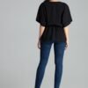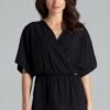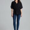 Black straight, loose-fitting blouse with short kimono sleeves finished with a cuff. Envelope neckline. At the waist sewn-in elastic band. Blouse falls freely on the hips.