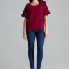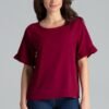 Straight-cut burgundy blouse with short, ruffled sleeves. Half-round neckline. Metal emblem with a brand logo at the bottom left edge.
