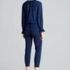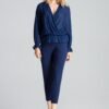 Navy blue brocade slightly transparent blouse with an envelope neckline, long sleeves. There is an elastic band at the waist and in the sleeves.