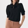 Elegant blouse with binding at the neckline is a perfect accent for soft-office stylizations. The elbow-length sleeves add charm and originality to the cut. Pleasant to the touch 100% viscose material ensures a high comfort of wearing.