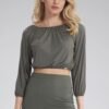 Short blouse with 3/4 sleeves, pleated neckline, sleeves and bottom, finished with sewn-in elastic band.