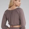Short blouse with 3/4 sleeves, pleated neckline, sleeves and bottom, finished with sewn-in elastic band.