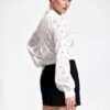 Elegant envelope blouse with long pleated sleeves with a cuff, fastened with a press stud. The bottom of the blouse is tied with a wide sash.