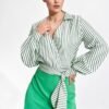 Elegant envelope blouse with long pleated sleeves with a cuff, fastened with a press stud. The bottom of the blouse is tied with a wide sash.