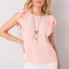 Blouse with short sleeves in the form of a frill. Round neckline, cut out at the back with binding.