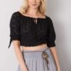 An interesting short sleeve blouse made of openwork pattern fabric. Tie at the front and sleeves.
