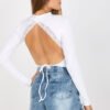 Blouse made of ribbed material, with long sleeves. At the back there is a large cutout decorated with lace, and binding.