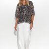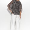 An airy women’s blouse with loose kimono-style sleeves. The bottom part is sewn from a solid fabric surrounding the body. The upper part is a mesh with a beautiful pattern appearing in as many as five variations: both animal, floral and abstract. Every fashion fan will find something for herself. The heart-shaped neckline optically lengthens the neck. The blouse provides a lot of freedom in the abdominal area. This is an ideal cut for women with an apple-type figure. Match the blouse with classic women’s pants and stilettos for a chic look at the office. You can also match the blouse with a tight skirt to emphasize your feminine silhouette.