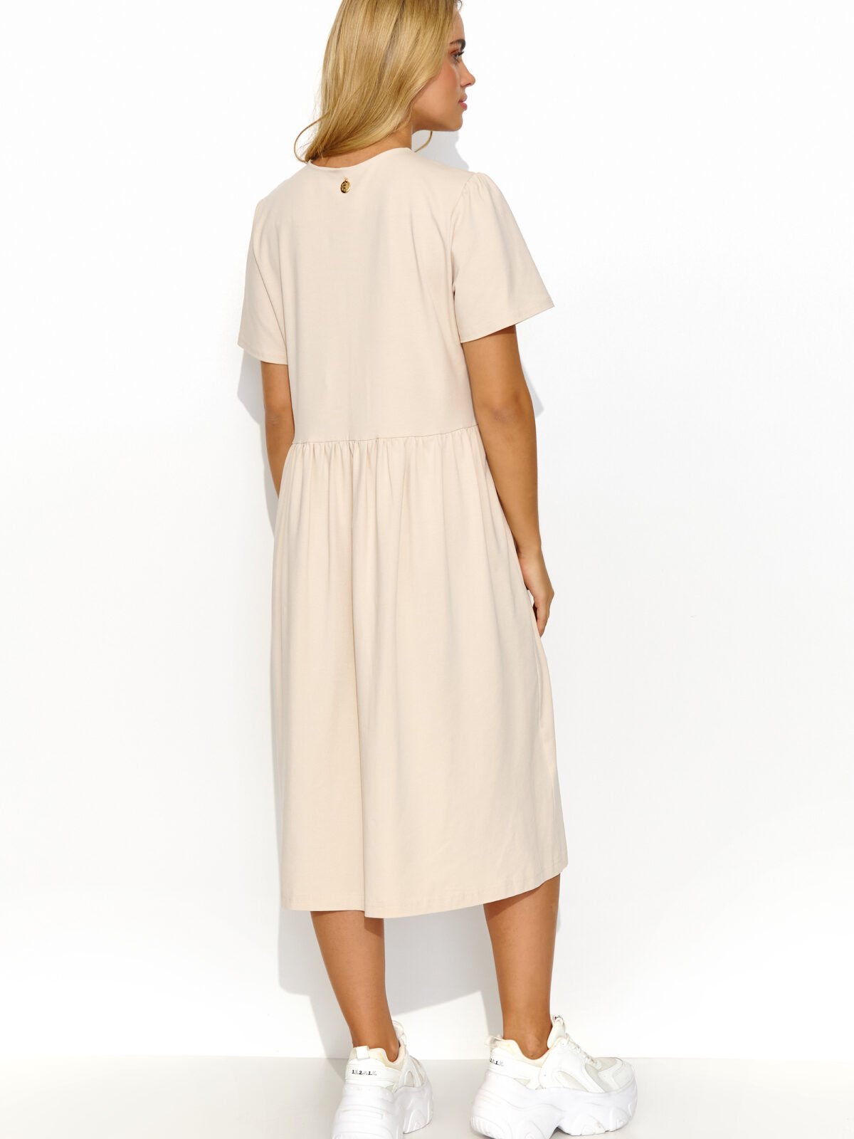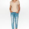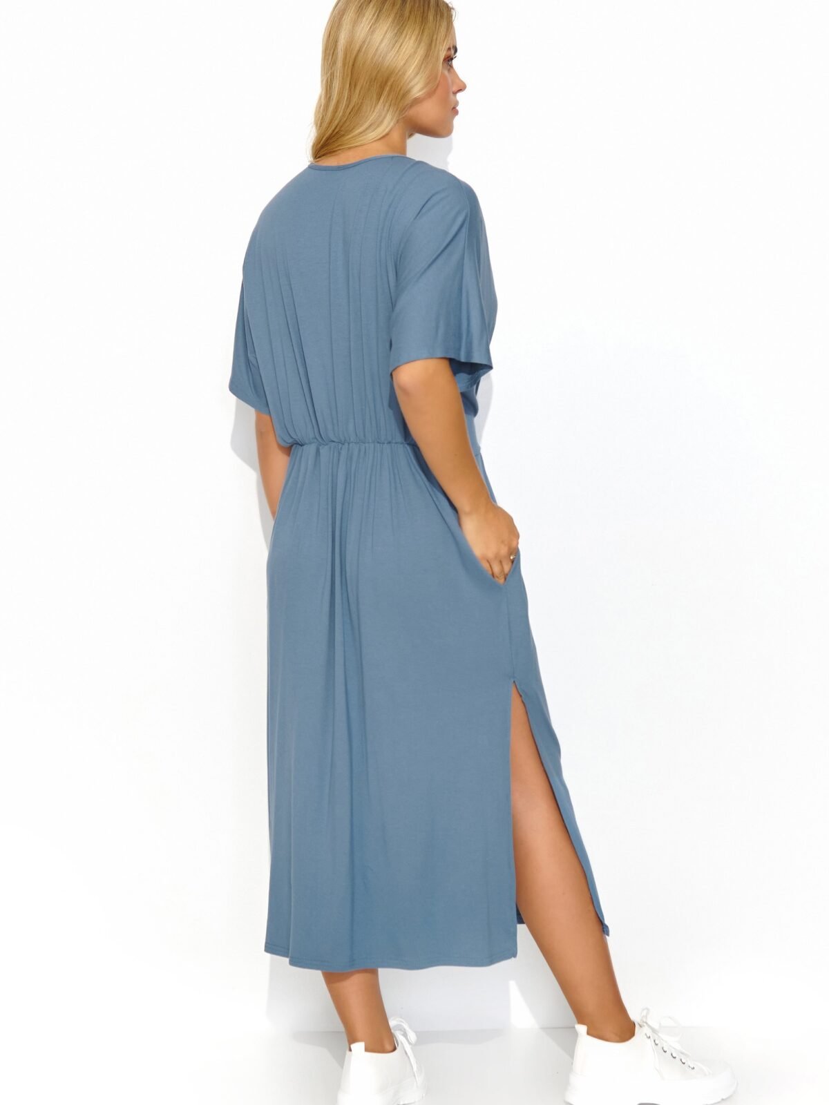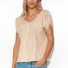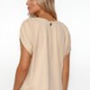 A casual women’s blouse sewn from a pleasant-to-touch breathable knit fabric. The short sleeves have ribbed cuffs located at the shoulder line. The back of the blouse is straight and uniform. A charming decorative plaque has been sewn on the top. The blouse with an oversize cut is suitable for both work and everyday wear. It provides full comfort while wearing. A rather deep v-neck exposes beautiful feminine clavicles. Wear it as you like, with shorts or a romantic skirt. The versatile blouse will work in almost any spring-summer styling.
