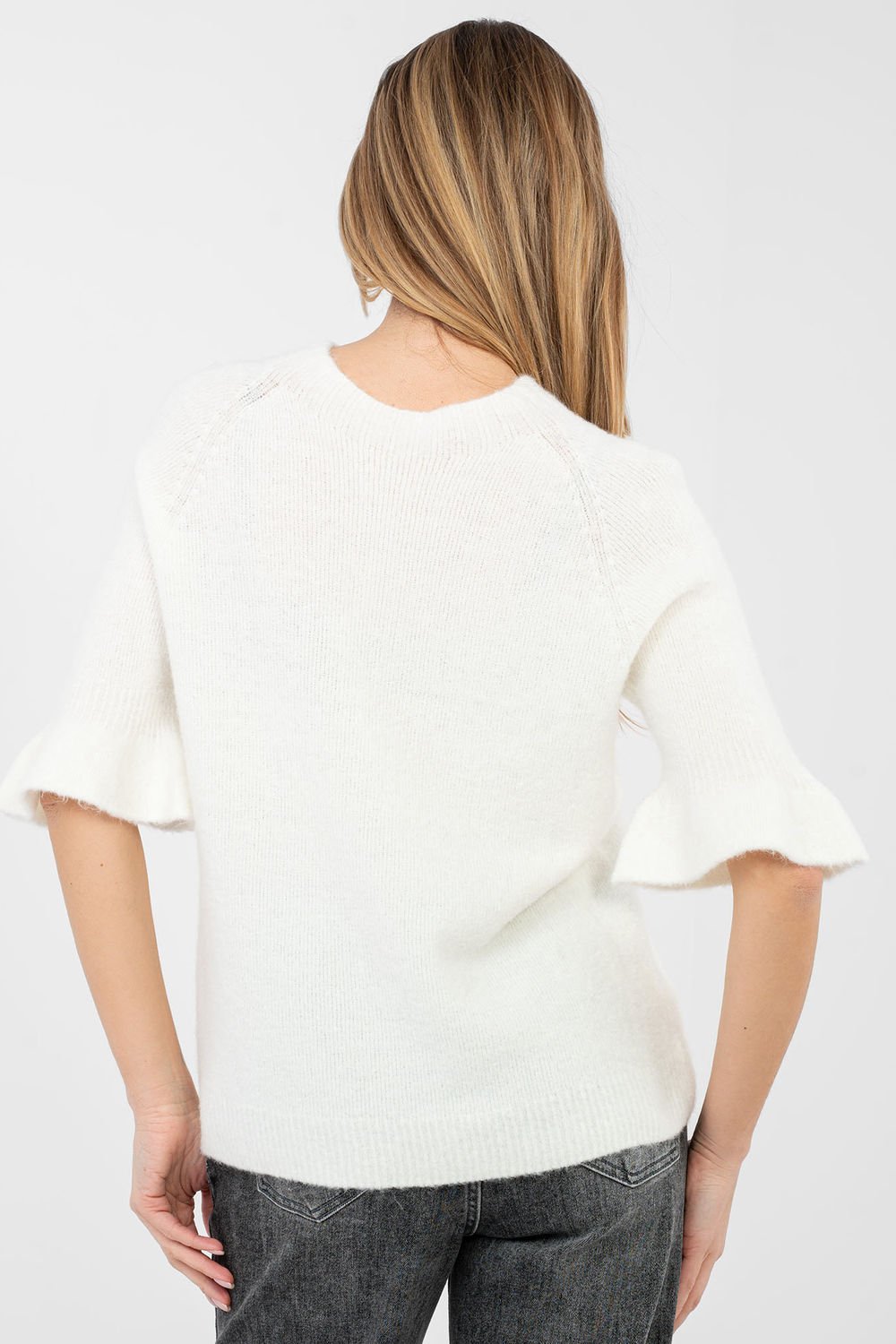 Blouse with an envelope neckline and long sleeves. At the bottom of the blouse a wide elastic band supports.