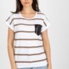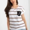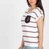 Women’s blouse with short sleeves and a round neckline in colorful stripes. There is a decorative pocket on the front.