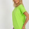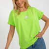 Women’s blouse with short sleeves and a round neckline. The blouse is made of solid material with a decorative patch on the front.
