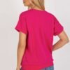 Women’s blouse with short sleeves and a round neckline. The blouse is made of solid material with a decorative patch on the front.