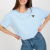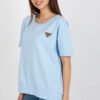 Women’s blouse with short sleeves and a round neckline. The blouse is made of solid material with a decorative patch on the front.