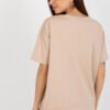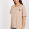 Women’s blouse with short sleeves and a round neckline. The blouse is made of solid material with a decorative patch on the front.