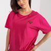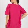 Women’s blouse with short sleeves and a round neckline. The blouse is made of solid material with a decorative patch on the front.