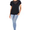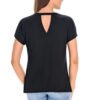 Bamboo short-sleeved women’s T-shirt in black. In its composition, in addition to bamboo, it has an elastic fiber, thanks to which it adapts perfectly to the figure. In the front on the neckline it is combined with a slightly translucent fine-weave mesh. Around the neck, the blouse is finished with a thin collar, and at the back it has a triangle-shaped slit. The blouse is halfway to the hips, slightly fitted. Bamboo fiber guarantees comfortable use, has antibacterial properties, is breathable, gentle to the skin and addresses allergy sufferers.