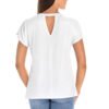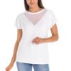 Women’s short-sleeved T-shirt made of high-quality bamboo fiber, which is very kind to the female body, has antibacterial properties and is aimed at women prone to allergies. The shirt is in the color of snow white. On the neckline it is combined with a see-through mesh with a fine weave, in the shape of a triangle. Around the neckline, which is round, the blouse is trimmed with a thin collar. At the back there is an open V-shaped slit. The blouse reaches to the middle of the hips, perfectly matching with fitted jeans or with a pencil skirt and a jacket.