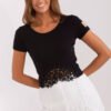 Short blouse of ribbed material, with short sleeves and round neckline. On the front at the bottom an insert of lace.