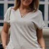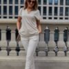 Blouse with falling sleeves in kimono style. Made of viscose knit with gold thread woven in. Very soft to the touch, sweater weave.