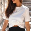 Short cream blouse, made of soft and delicate cotton, suitable for the skin. It has characteristic pleating on the front, which gives it a feminine and sensual character. The blouse is adorned with a detachable decorative rose, handcrafted from the same material. It is an extremely fashionable accessory for styling, you can pin it wherever you like – on the shoulder, abdomen, or even on a bag or scarf. It will definitely be useful in both casual and more formal outfits, even under a blazer.