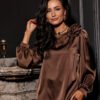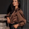 Evelyn blouse is a model created from satin fabric, which gives the styling an extremely elegant and luxurious look. The round neckline is decorated with a striking rose, which adds nonchalance and style, while making the blouse stand out for its originality. Wide, buffeted 3/4-length sleeves beautifully expose the shoulders and feminine silhouette. Its loose cut guarantees freedom of movement and wearing comfort. Evelyn blouse is perfect for elegant and formal styling. You can match it with long satin pants, a tight midi skirt and a straight cut blazer and long over-the-knee boots to get an extremely impressive styling suitable for festive outings and elegant celebrations. The product is made and sewn in Poland.