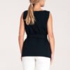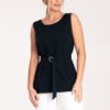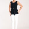 Trapezoidal, elegant unbuttoned blouse. At the height of the bust two oblique darts, a boat neckline, at the waist a fabric belt with a decorative gold buckle.