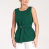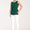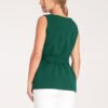Trapezoidal, elegant unbuttoned blouse. At the height of the bust two oblique darts, a boat neckline, at the waist a fabric belt with a decorative gold buckle.