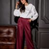 Evelyn blouse is a model made of satin material, which gives the styling an extremely elegant and luxurious look. The round neckline is decorated with an impressive rose, which adds nonchalance and style, while making the blouse stand out with originality. Wide, puffy long sleeves beautifully expose the shoulders and feminine silhouette. Its loose fit guarantees freedom of movement and wearing comfort. The Evelyn blouse will work perfectly in elegant and festive stylings. You can pair it with long satin pants, a tight midi skirt, a simple-cut blazer, and knee-high boots to achieve an incredibly striking styling suitable for holiday outings and elegant celebrations. The product is manufactured and sewn in Poland.