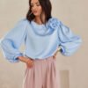 Blouse Evelyn is a model made of satin material, which gives the styling an extremely elegant and luxurious look. The round neckline is adorned with a spectacular rose, which adds nonchalance and style, while making the blouse stand out with originality. The wide, puffy long sleeves beautifully expose the shoulders and feminine silhouette. Its loose fit guarantees freedom of movement and comfort of wearing. Blouse Evelyn will work perfectly in elegant and festive stylings. You can pair it with long satin trousers, a tight midi skirt, a blazer with a simple cut, and knee-high boots to achieve an extremely eye-catching styling suitable for holiday outings and elegant celebrations. The product is manufactured and sewn in Poland.
