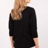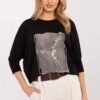 Casual blouse put on over the head, perfect for everyday wear and for work. Made of soft and stretchy cotton with elastane, it provides comfort and perfect fit. The model with standard length and 3/4 sleeves is a universal choice for every season. On the front of the blouse, there is a striking print decorated with shiny jet stones, which add an elegant and fashionable character to it. It pairs well with both jeans and a skirt, creating a stylish and comfortable outfit.