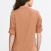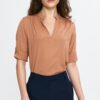 Stylish blouse with a regular cut, made of lightweight, viscose material that provides comfort throughout the day. The V-neck subtly accentuates the neck, and the sleeves with a cuff allow for length adjustment, reaching just above the elbow, creating a light effect. Delicate pleats are located at the collarbone line, adding feminine charm to the blouse. A model to be put on over the head, perfect for casual, but also elegant everyday styling.