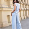 Smooth blouse with a simple cut. Short sleeves and a standard length reaching the hips. Decorative fastening on the back with a small button.