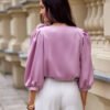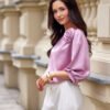 Model Giana is a blouse made of elegant, satin material. The round neckline of the blouse is adorned with a spectacular rose, which adds class and elegance and makes the blouse look extremely original. Wide, puffy sleeves that are 3/4 length beautifully emphasize the shoulders and feminine silhouette. Its loose cut provides freedom of movement and comfortable wear. Blouse Giana will be perfect for elegant and festive stylizations. Match it with long satin trousers Elsa, a jacket with a simple cut and classic heels, and enjoy impeccable styling perfect for various events such as communions, holidays, baptisms, or birthdays.