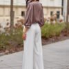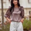 Model Giana is a blouse made of elegant, satin material. The round neckline of the blouse is adorned with a striking rose, which adds class and elegance to the blouse, making it look extremely original. Wide, puffy sleeves with a length of 3/4 beautifully emphasize the shoulders and feminine silhouette. Its loose cut provides freedom of movement and comfort when wearing. Blouse Giana will be perfect for elegant and festive stylizations. Pair it with long satin trousers Elsa, a jacket with a simple cut, and classic high heels, and enjoy impeccable styling perfect for various events such as communions, holidays, christenings, or birthdays.
