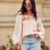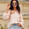 Blouse in the Spanish style with long, billowy sleeves. It has an elastic band at the neckline, which allows for adjustment and proper regulation. Decorative rose element.