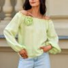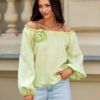 Spanish type blouse with long, puffy sleeves. It has an elastic band on the neckline, which allows for adjustment and proper regulation. Decorative rose element.