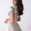 Tulle blouse with short sleeves is a unique piece of clothing that combines lightness and elegance. Made of delicate, semi-transparent material, it subtly accentuates the silhouette, giving the styling a feminine charm. Round neckline adds a classic character, and colorful print attracts attention and gives the blouse a unique expression. Perfect for both everyday wear and special occasions, it pairs well with jeans, skirts, or elegant trousers.